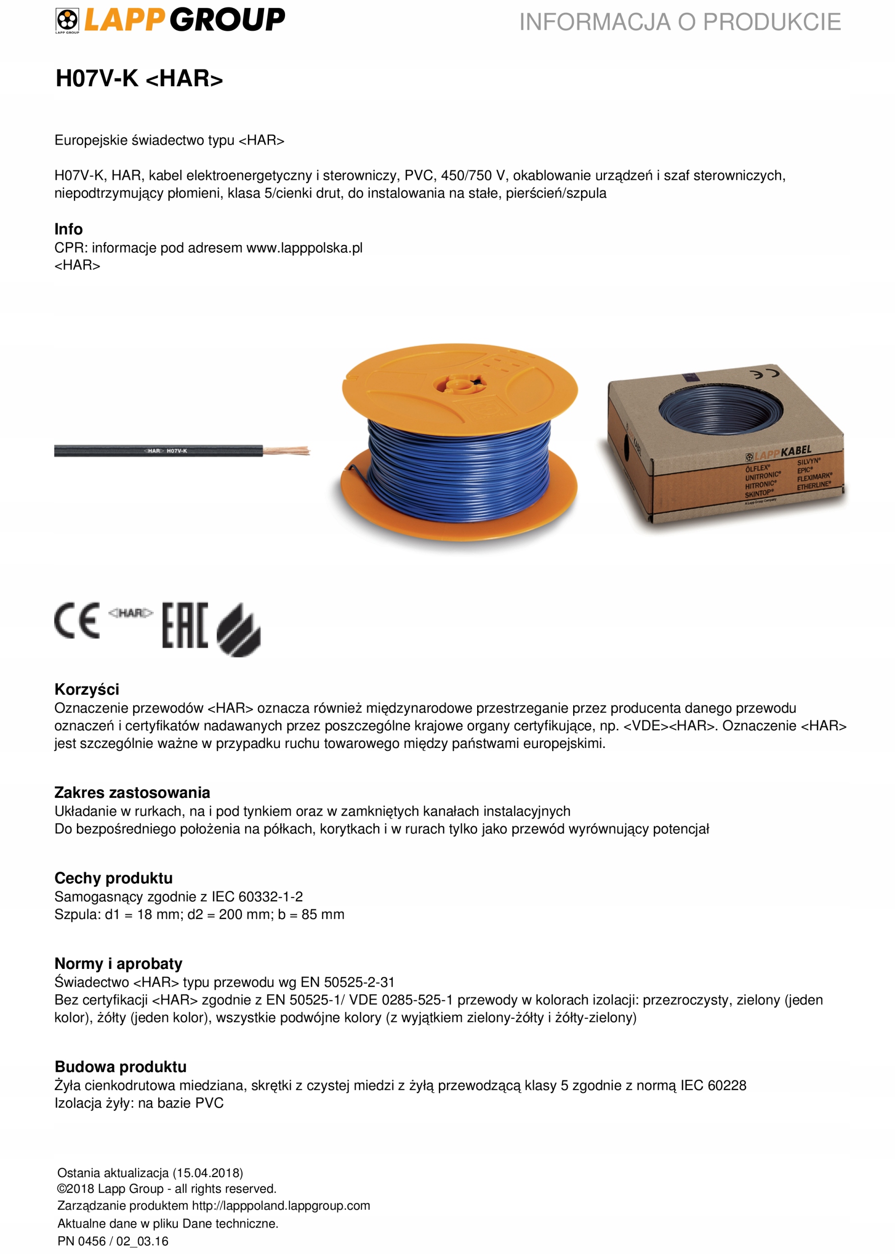 Marka LAPP KABEL istnieje od roku 1957 i słynie z wyjątkowo dobrej jakości wyrobów. Kable i przewody marki LAPP KABEL sprawdzają się w zastosowaniach inżynierii mechanicznej, przemyśle samochodowym, technologiach pomiarowych i kontrolnych, w instalacjach zasilających i wielu innych. Produkcja wyrobów jest prowadzona głównie w 17 własnych zakładach przemysłowych umiejscowionych w Europie, Ameryce i Azji. Rezultatem jest ponad 40.000 różnych standardowych produktów.